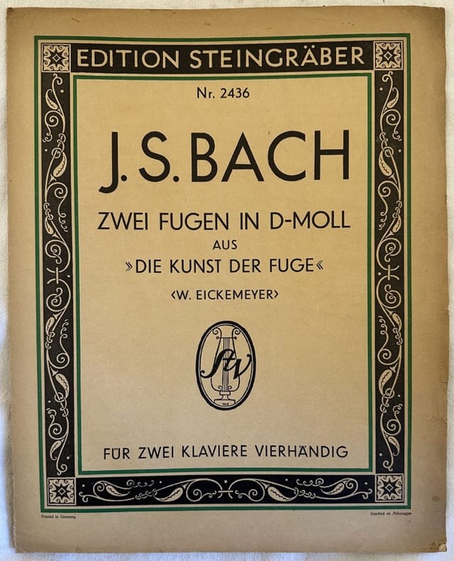 Edizione del 1929 di questa melodia per pianoforte a quattro mani "Fuga I in Bemolle" del compositore tedesco Johann Sebastian Bach (1685-1750). Insieme allo spartito Fuga I per due pianoforti, edizione Peters 6734. In ottime condizioni. Copertina editoriale. In folio. cm. 33,5x26,5. Pp. 8, 4, 4.Edition of 1929 of this musical score of the melody "Fugen in D-moll" by the german composer Johann Sebastian Bach (1685-1750). Together with the score Fuga I for two scores, edition Peters 6734.In very good conditions. In folio. cm. 30,5x23. Pp. 8, 4, 4.