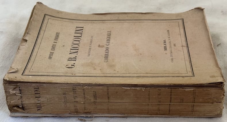 Edizione del 1863 di questa raccolta di poesie di Giovanni Battista Niccolini (San Giuliano Terme 1782- 1861) raccolte a cura di Corrado Gargiolli. Niccolini in politica fu liberale, repubblicano, anticlericale e contrastò l'ideologia neoguelfa. All'interno: Canzoniere naizonale, Napoleone a Sant'Elena, Stato d'Italia inannzi l'anno 1848, Risorgimento d'Italia, Caduta d'Italia, Dolori e speranze d'Italia, Rinnovamento d'Italia, Epigrammi, Pensieri poetici ecc... In discrete condizioni. Copertina editoriale in discrete condizioni con usure e mancanze marginali. Legatura in mediocri condizioni con rotture. Pagine in buone condizioni con rare fioriture. In 8. Dim. 24,5x16. Pp. 683+(5).Edition of 1863 of this collection of poems by Giovanni Battista Niccolini (San Giuliano Terme 1782- 1861) collected by Corrado Gargiolli. Inside: Canzoniere naizonale, Napoleone a Sant'Elena, Stato d'Italia inannzi l'anno 1848, Risorgimento d'Italia, Caduta d'Italia, Dolori e speranze d'Italia, Rinnovamento d'Italia, Epigrammi, Pensieri poetici ecc... In fair conditions. Editorial cover in fair conditions lightl worn in the extremities. Binding in poor conditions with cracks. Pages in good conditions with occasional foxing. In 8. Dim. 24,5x16. Pp. 683+(5).