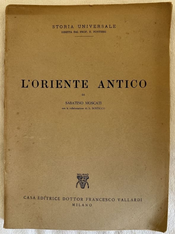 Prima edizione del 1952 di questa opera sull'Orient eantico scritta dall'archeologo Sabatino Moscati (1922-1997). Alla fine del volume 31 tavole che mostrano reperti e monumenti. All'interno: Protostoria, Sumeri e semiti in Mesopotamia, Amorrei e impero di Hammurapi, Medio Regno in Egitto, Hittiti, Hurriti, Età cassita in Babilonia, Assiri, Semiti in Siria e Palestina, Aramei, Ebrei, Caldei, Persiani ecc... In buone condizioni. Copertina editoriale in buone condizioni generali con lievi usure ai margini. Legatura in buone condizioni. Pagine in buone condizioni con rare fioriture. In 8. 26x19,5 cm. Pp. XII+137+(1)+XXXI. First edition of 1952 of this work about history about jewish about the archeologist Sabatino Moscati (1922-1997). At the end of the volume 31 planches showing monuments and pieces of art. Inside: Protostoria, Sumeri e semiti in Mesopotamia, Amorrei e impero di Hammurapi, Medio Regno in Egitto, Hittiti, Hurriti, Età cassita in Babilonia, Assiri, Semiti in Siria e Palestina, Aramei, Ebrei, Caldei, Persiani ecc... In good conditions Editorial cover in good general conditions slightly worn in the extremities. Binding in good conditions. Pages in good conditions with occasional foxings.In 8. 26x19,5 cm. Pp. XII+137+(1)+XXXI.