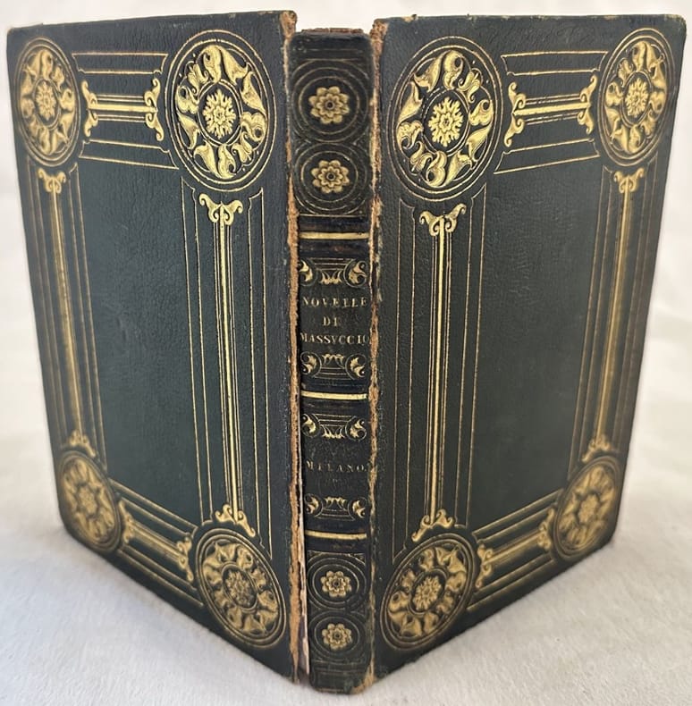 Rara edizione della celebre opera dello scrittore e novellista Masuccio Salernitano (Salerno 1410 circa-Salerno 1475) Testo a cura di Sebastiano Corrado il cui nome compare nella dedica a c. A2r. Redatte in volgare e sul modello bocaccesco, il Novellino è una raccolta di 50 racconti satirici e grotteschi dal forte stampo anticlericale , ognuno preceduto da una lettera di dedica a un personaggio famoso e con un epilogo con la morale della storia. L'opera, pubblicata postuma nel 1476 venne inserita nel primo Indice dei libri proibiti. Shakespeare per la sua "Romeo e Giulietta" si ispirò direttamente alla XXXIII novella "Mariotto e Ganozza". Marca degli eredi di Melchiorre Sessa il vecchio (V477=Z587) sul front. La datazione, compresa negli anni di attività degli editori (dal 1565 fino al 1629 circa) si può dedurre dalla marca, attestata dal 1570 fino a circa il 1597 (cfr. EDIT16). I Sessa pubblicarono il Novellino nel 1531, 1535, 1539, 1541 ma questa edizione presenta delle particolarità secondo Brunet e Settembrini: "Probabile contraffazione del principio del XVIII secolo, cfr.: J.C. Brunet, Manuel du libraire et de l'amateur de livres. v. III, col. 1524; o forse del XVII secolo: L. Settembrini, Novellino ... restituito alla sua antica lezione, Napoli, A. Morano, 1874, p. XXXIX: "pare fatta nel principio del Seicento. E' scorrettissima ... ed è detta l'Edizione della Gatta (CFR. OPAC SBN). Antica nota di possesso al frontespizio. In buone condizioni. Copertina in piena pelle con ricche decorazioni in oro e piatti in discrete condizioni con usure marginali. Piatto posteriore staccato. Legatura in buone condizioni. Pagine in buone condizioni con fioriture. Abile restauro al frontespizio e ai margini da p. 51 a 68 e da 101 a 138 senza perdita di testo. In 16. Dim. 17,5x12. Pp. 341+(1). Peso Kg. 0,316.Scarce edition of the famous work by the writer and novelist Masuccio Salernitano (Salerno 1410 circa-Salerno 1475) Text cared by Sebastiano Corrado whom name compares in the prefation of p. A2r. il Novellino, written in italian and following the style of Boccaccio Decameron, is a collection of 50 satyrical and grotesque tales of anti church mark, each one with a letter of dedication to a famous carachter and with the moral of story. The work was published posthumous in 1476 and put in the first book of Index Librorum Prohibitorum. Shakespeare for his "Romeo e Giulietta" inspired directly to the XXXIII novel "Mariotto e Ganozza". Mark of heirs of Melchiorre Sessa il vecchio (V477=Z587) in the title page.We can deduce the date from the years of activity of the editor (from 1565 to 1629 circa)and from the mark: from 1570 to circa 1597 (cfr. EDIT16). Sessa published the Novellino in 1531, 1535, 1539, 1541 but this edition have some particularities according to Brunet and Settembrini: "Probabile contraffazione del principio del XVIII secolo, cfr.: J.C. Brunet, Manuel du libraire et de l'amateur de livres. v. III, col. 1524; o forse del XVII secolo: L. Settembrini, Novellino ... restituito alla sua antica lezione, Napoli, A. Morano, 1874, p. XXXIX: "pare fatta nel principio del Seicento. E' scorrettissima ... ed è detta l'Edizione della Gatta (CFR. OPAC SBN). Antique owner note in the title page. In good conditions. Full leather cover with rich gilted title and decorations in the spine and plates in fair conditions with wearings. Back plate detached. Binding in good conditions. Pages in good conditions with foxing. Skill restauration in the title page and edges from p. 51 to 68 and from 101 to 138 with no loss of text. In 16. Dim. 17,5x12. Pp. 341+(1). Weight Kg. 0,316.