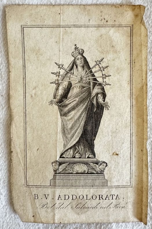 Santino del 1850 circa della Beata Vergine Addolorata. In buone condizioni. Dim. cm 10,5x7. Holy imagine of 1850 circa of the Blessed Madonna of pain In good conditions. Dim. cm 10,5x7.