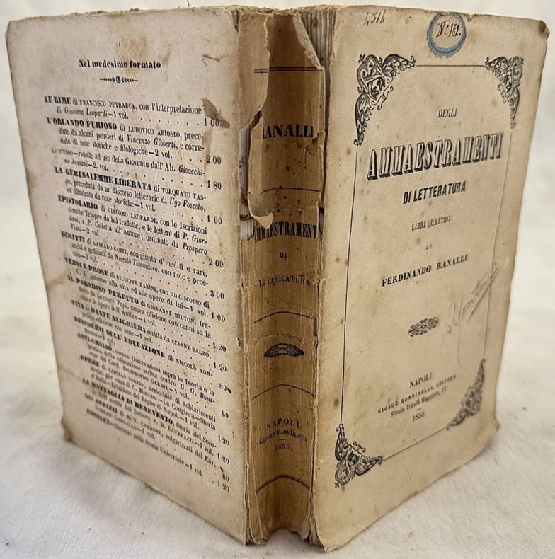 Edizione del 1855 di quest opera del letterato, storico e critico letterario Ferdinando Ranalli (1813-1894). All'interno: Dell'arte dello scrivere (elementi fondamentali, figure retoriche, spiega le tecniche per i discorsi; l'eleganza, i caratteri dello scrivere per il sublime, il commotivo; il genere narrativo, poetico, la prosa, l'eloquenza; i diversi componimenti poetici) ecc... Firma in copertina. In discrete condizioni. Copertina editoriale in buone condizioni generali con usure ai margini e dorso. Piatto anteriore staccato. Legatura in buone condizioni. Pagine in buone condizioni con rare fioriture. In 8. cm 19x12. Pp. XXXI+567+(1)Edition of 1855 of this work by Ferdinando Ranalli. The author analyzes the art of writing: main elements, rethorical figures, he explains the techniques for the speech; the charachters, the art of writing for th sublime, the narative, poetic, prose kind, the eloquence; the different poetic cmponents. Signature in the cover. In fair conditions. Editorial cover in good conditions lightly worn in the extremities. Fron plate is detached, Binding in good conditions. Pages in good conditions with occasional foxing. In 8. cm 19x12. Pp. XXXI+567+(1)
