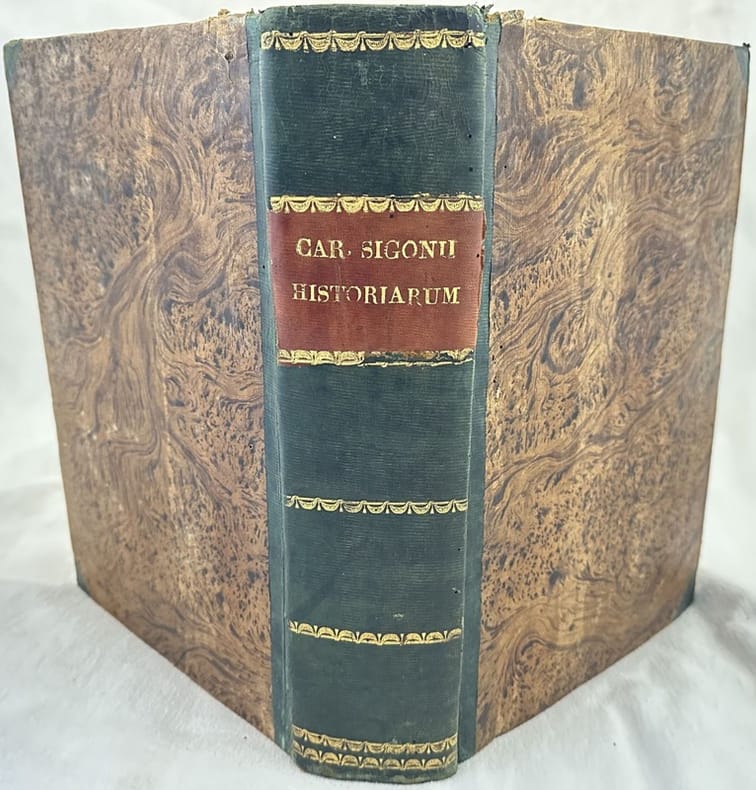 Prima edizione del 1580 di questa monumentale opera sulla storia d'Italia scritta da Carlo Sigonio (Modena 1524- Ponte Basso (Modena) 1584) storico e letterato insegnante di Umanità presso l'Università di Bologna. L'opera è composta da due parti legate insieme, ognuna con proprio frontespizio, ed è completa. Il primo tomo è l'edizione del 1580. La lettera del tipografo all'editore è stata legata alla fine del primo tomo mentre l'indice dello stesso alla fine del volume. Il secondo tomo è la rara edizione veneziana del 1591, lo stampatore Franciscum Senensem. L'autore dedicò gli ultimi anni della sua vita alla stesura dell'opera che tratta meticolosamente il periodo che va dall'anno 565 al 1286. Vignetta xilografia in ogni frontespizio. Al tomo primo: Figura femminile loricata: Bologna che tiene col braccio sinistro la cornucopia e con il destro lo stendardo con la scritta Libertas. Motto: Bononia docet. In buone condizioni. Copertina in mezza pelle ottocentesca con titolo in oro al dorso in buone condizioni generali con lievi usure ai margini e dorso. Legatura in discrete condizioni con lievi rotture. All'interno le pagine si presentano in buone condizioni con rare fioriture. Segni di tarlo marginali alle prime 12 carte. Restauro al verso del frontespizio e alla carta A2. In folio. Dim. 31,5x22x7,5 cm. Pp. 666+(2)+(8)+234+(24)+(65). Peso Kg. 2,500.First edition of 1580 of this monumental work about the history of IKtaly written by Carlo Sigonio (Modena 1524- Ponte Basso (Modena) 1584) historian and letterate teacher of humanity in the University of Bologna. The work is made up of two tomes, each one with its own title page bound in the same volume and it is complete. The first tome is the edition of 1580. The letter of typographer has been bound in the end of the first tome, the index at the end of the volume. The second tome is the sacrce venetian edition of 1591, the publisher Franciscum Senensem. The author dedicated the last years of his life to the work that describes the history of Italy from 565 to 1286. In good conditions. Half leather cover of 19th century in good general conditions lightly worn in the extremities. Binding in fair conditions with light cracks. Inside pages are in good conditions with occasional foxing. Worming in the edges of the first 12 pages. Restauration in the verso of the title page and input page a2. In folio. Dim. 31,5x22x7,5 cm. Pp. 666+(2)+(8)+234+(24)+(65). Weight Kg. 2,500.