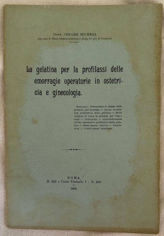 Interessante pubblicazione di ostetricia del 1905 di Cesare Micheli.<BR>L'autore descrive l'utilizzo della gelatina come emostatico nelle operazioni chirurgiche di ostetricia e ginecologia, indicandone l'utilizzo. In ottime condizioni. Brossura editoriale in ottime condizioni generali con lievi usure ai margini e dorso. Legatura in ottime condizioni. All'interno le pagine si presentano in ottime condizioni con rare fioriture. In 8. Dim. 21x14,5 cm.Pp. 35. Interesting pamphlet of obstetrics of 1905 by Cesare Micheli.<BR>The author describes the usage of jam in obstetrical poperations as an emostatic and describes its usage. In very good conditions. Editorial cover in very good general conditions slightly worn in the extremities. Binding in very good conditions. Inside pages are in very good conditions with occasional foxings. In 8. Dim. 21x14,5 cm.Pp. 35.