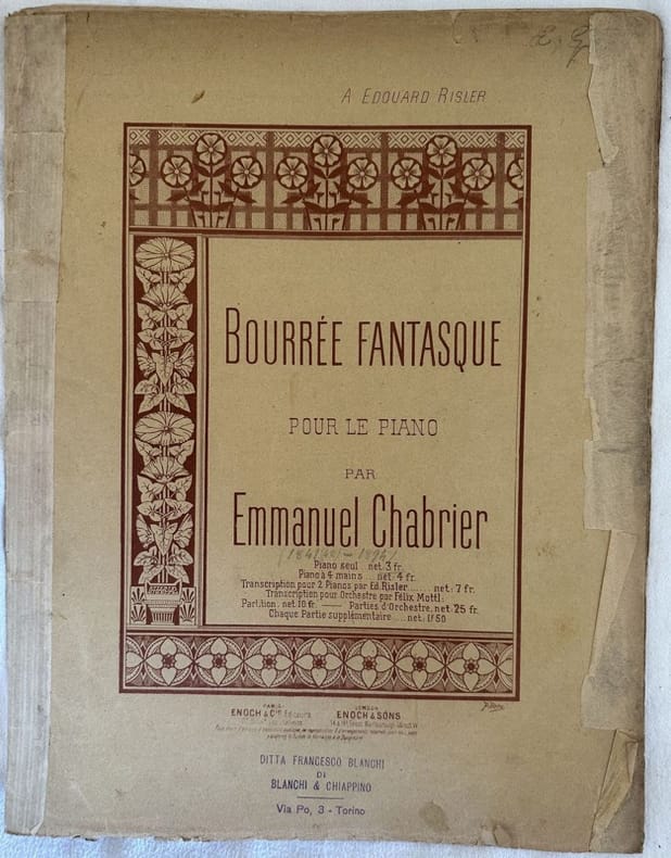 Edizione della fine dell'ottocento inizi novecento di questo spartito per pianoforte della melodia "Bourrée Fantasque" di Emmanuel Chabrier (1841-1894) compositore e pianista di epoca romantica. Frontespizio figurato di P. Boriee e firma. In discrete condizioni. Copertina editoriale in discrete condizioni con lievi usure marginali. Dorso rinforzato. Legatura editorialmente assente. Pagine in buone condizioni con rare fioriture. In folio. cm. 35,5x27. Pp. 13 Edition of end of 19th early 20th century of this melody for piano "Bourrée Fantasque" by Emmanuel Chabrier (1841-1894) composer and pianist of romantic period. Figurated title page by P. Boriee and signature. In fair conditions. Editorial cover in fair conditions lightly worn in the extremities. Reinforced spine. Binding editoriarly missing. Pages in good conditions with occasional foxing. In folio. cm. 35,5x27. Pp. 13.