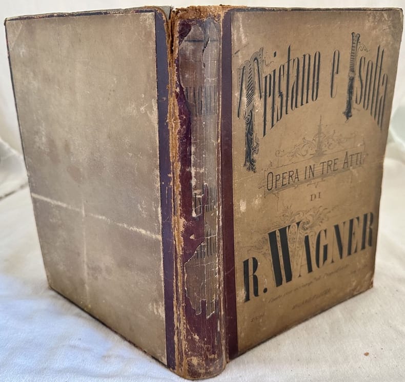 Edizione del 1880 circa dell'opera in tre atti "Tristano e Isotta" di Richard Wagner (1813-1883) compositore, librettista, direttore d'orchestra tedesco. L'opera venne rappresentata per la prima volta al Regio teatro di Monaco il 10 Giugno 1865. Versione italiana dal testo originale tedesco di Arrigo Boito. La prima pagina riporta lista dei personaggi. Accanto nota manoscritta datata 30 marzo 1937 che riporta il nome degli attori. Partitura per pianoforte e canto. In buone condizioni. Copertina in mezza pelle con brossura editoriale applicata al dorso e piatti in discrete condizioni con usure marginali e mancanze. Legatura in buone condizioni. Pagine in buone condizioni con rare fioriture. In folio. cm. 29x22. Pp. 20+8+12+16+36+8+8+44+4+32+80+24+72+16+20. Edition of 1880 circa of the opera in three acts "Tristano e Isotta" by the italian composer Giuseppe Verdi (1813-1901) on booklet of Francesco Maria Piave. The work was represented for the first time in Regio teatro di Monaco the 10th of June 1865. Italian version from the original text byArrigo Boito. The first pages contains the list of carachters with an handwritten note with the name of the actors and the date 30th of march 1937. Score for piano and chant. In good conditions. Half leather cover with editorial cover applied in the spine and plates in fair conditions lightly worn in the extremities. Binding in good conditions. Pages in good conditions with occasional foxing. In folio. cm. 29x22. Pp. 20+8+12+16+36+8+8+44+4+32+80+24+72+16+20