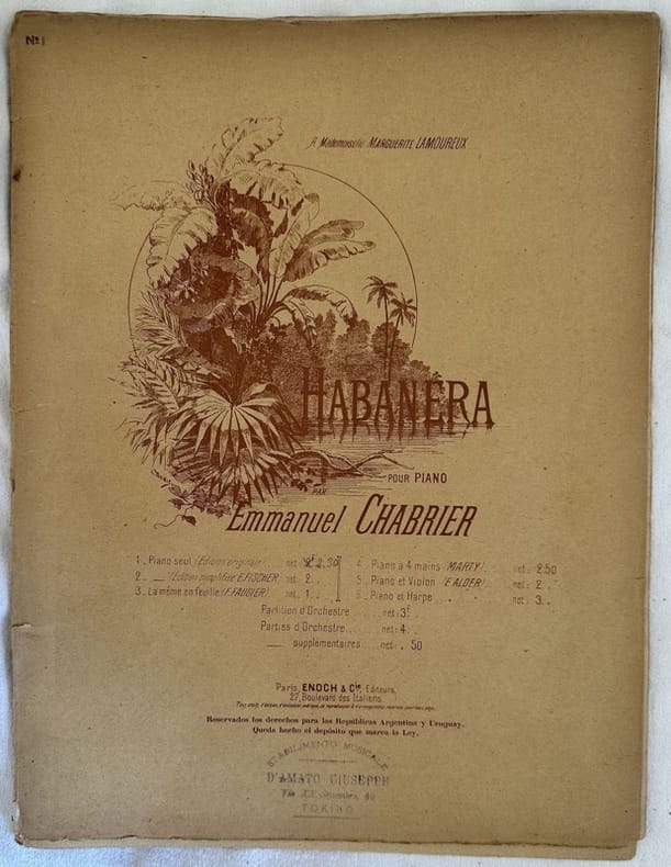 Edizione della fine dell'ottocento inizi novecento di questo spartito per pianoforte della melodia "Habanera" di Emmanuel Chabrier (1841-1894) compositore e pianista di epoca romantica. In discrete condizioni. Copertina editoriale in discrete condizioni con lievi usure marginali. Piatti staccati. Legatura editorialmente assente. Pagine in buone condizioni con rare fioriture. In folio. cm. 35,5x27. Pp. 7. Edition of end of 19th early 20th century of this melody for piano "Habanera" by Emmanuel Chabrier (1841-1894) composer and pianist of romantic period. In fair conditions. Editorial cover in fair conditions lightly worn in the extremities. Platesa detached. Binding editoriarly missing. Pages in good conditions with occasional foxing. In folio. cm. 35,5x27. Pp. 7