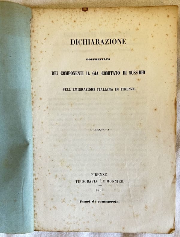 Interessante pubblicazione, una dichiarazione sull'emigrazione italiana in Firenze edita dal Comitato di Sussidio per l'emigrazione Italiana a Firenze. In buone condizioni. Copertina editoriale in buone condizioni generali con lievi usure ai margini e dorso. Legatura in buone condizioni. Pagine in buone condizioni con rare fioriture. In 8. cm. 21,5x14. Pp. 50.Interesting pamphlet, a declaration about italian emigration in Florence edited by Comitato di Sussidio for italian emigration in Florence. In good conditions. Editorial cover in good conditions lightly worn in the extremities. Binding in good conditions. Pages in good conditions with occasional foxing. In 8. cm. 21,5x14. Pp. 50.