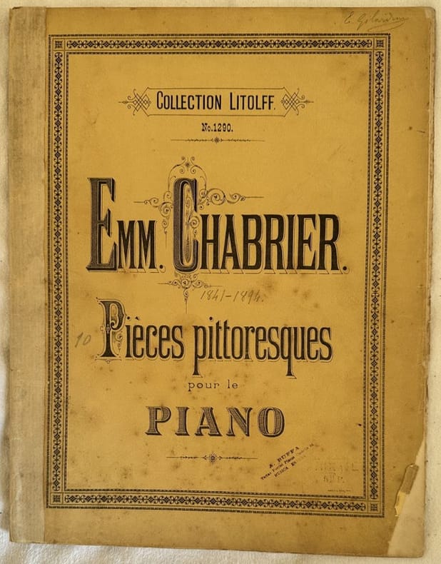 Edizione della fine dell'ottocento inizi novecento di questo spartito, una raccolta di melodie per pianoforte "Pieces pittoresques" di Emmanuel Chabrier (1841-1894) compositore e pianista di epoca romantica. In discrete condizioni. Copertina editoriale in discrete condizioni con lievi usure marginali. Rinforzo al dorso. Legatura in buone condizioni. Pagine in buone condizioni con rare fioriture. In folio. cm. 31x24. Pp. 11+3+5+7+5+7+7+7+9+11. Edition of end of 19th early 20th century of this collection of melodies for piano "Pieces pittoresques" by Emmanuel Chabrier (1841-1894) composer and pianist of romantic period. In fair conditions. Editorial cover in fair conditions lightly worn in the extremities. Reinforcement in the spine. Binding in good conditions. Pages in good conditions with occasional foxing. In folio. cm. 31x24. Pp. 11+3+5+7+5+7+7+7+9+11