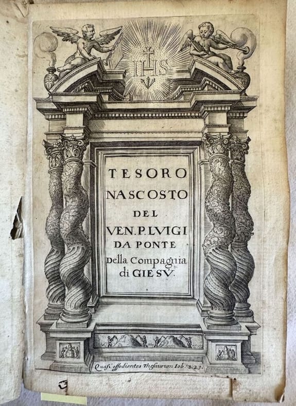 Edizione originale del 1690 di questa opera di ascetica del gesuita spagnolo e scrittore ascetico Luigi Ponte (Luis de la Puente) (1554-1624). L'opera è in un volume ed è completa. Traduzione a cura di Camillo Maria Rinaldi. All'interno: Meditazioni sulla providenza, infermità, malattie, tentazione, Sacramento dell'estrema unzione, buona morte ecc... Frontespizio figurato. Aluni fiori secchi nel volume che tuttavia non hanno provocato macchie nella carta. In buone condizioni. Copertina in piena pergamena coeva con titolo manoscritto al dorso in ottime condizioni generali con lievi usure ai margini e dorso. Legatura in discrete condizioni, corpo del libro in parte staccato. Pagine in buone condizioni con rare fioriture. Piccolo forellino a pag. 119 e 121 con leggera perdita di testo. In 16. cm. 16x11. Pp. XXIX+(1)+375+(1). Original edition of 1690 of this work of ascetic by the jesuit ascetic spanish writer Luigi Ponte (Luis de la Puente) (1554-1624). The work is in one volume and it is complete. Translation by Camillo Maria Rinaldi. Inside: meditations about providence, illness, deseases, temptations, extreme unction, good death ecc... Figurated title page. Some dried flowers in the volume that did not cause any stain in paper. In good conditions. Parchment coeval cover with handwritten title in the spine in very good conditions lightly worn in the extremities. Binding in fair conditions, the body fo the book partially detached. Pages in good conditions with occasional foxing.Little hole in pag. 119 and 121 with light loss of text. In 16. cm. 16x11. Pp. XXIX+(1)+375+(1).