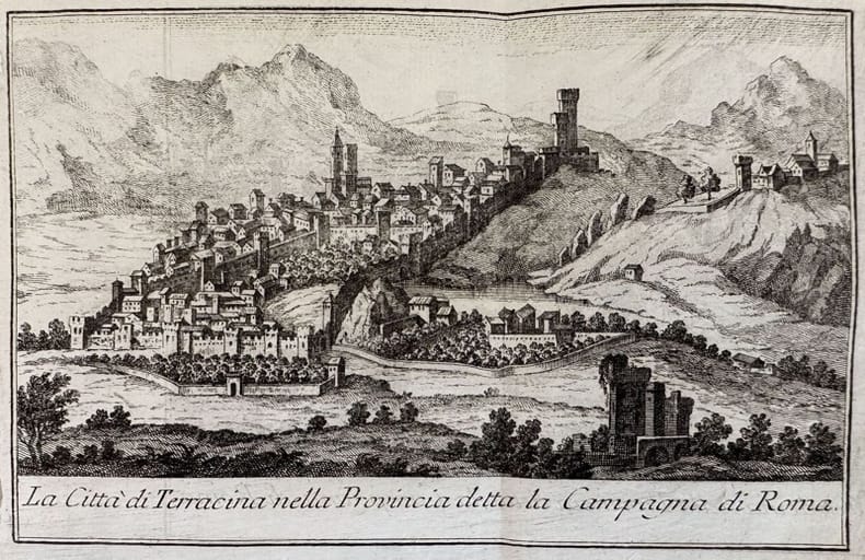 Veduta animata panoramica della città di Terracina nella Campagna di Roma. Atlante: Lo stato presente di tutti i popoli del mondo 1738-66 Autore: Thomas Salmon (1679-1767) Data: 1759 Tecnica: incisione su rame Dimensione del foglio: 132x174 mm Dimensione incisione: 152x97 cm Condizioni: Buone. Rare fioriture.Panoramic animated view of the city of Terracina. Atlas: Lo stato presente di tutti i popoli del mondo 1738-66 Autore: Thomas Salmon (1679-1767) Date: 1759 Technique: Copper etching Leaf Dimension: 132x174 mm Engraving Dimension: 152x97 cm Conditions: Good conditions. Occasional foxing.