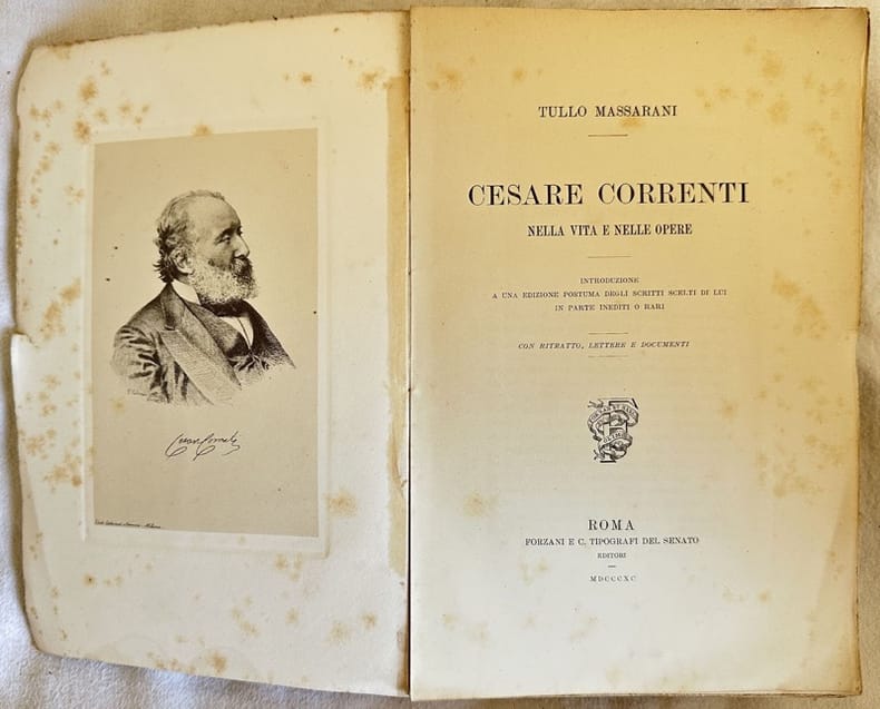 Prima edizione del 1890 di questa opera su Cesare Correnti scritto da Tullo Massarani. Correnti (Milano 1815-Lesa 1888) è stato un funzionario patriota e politico italiano, deputato del Re di Sardegna e poi del Regno d'Italia dal 1849. All'interno vita di Correnti, Documenti inediti (Il giovane patriziato liberale, Il 48 (Il Manifesto, Informazioni e opinioni dominanti, I negoziati colla Svizzera), Atteggiamento della Francia, Il rifiuto della pace all'Adige, Atteggiamento della Germania, Il quarantotto giudicato da un membro del Governo Provvisorio della Lombardia), La difesa di Venezia (Legazioni del Correnti durante il Governo provvisorio della Lombardia, Legazioni del Correnti durante l'Armistizio Salasco, Legazioni del Correnti approssimandosi la Campagna del 1849, Testamento militare di Guglielmo Pepe, Altri documenti e Frammenti inediti. Ritratto in antiporta. Esemplare numerato 981 In buone condizioni e completo. Copertina editoriale in mediocri condizioni con lievi usure marginali. Piatto anteriore mancante. Legatura quasi assente. Pagine in buone condizioni con rare fioriture. In 8. 23,5x15,5 cm. Pp. VIII+653+(5). First edition of 1890 of this work by Cesare Correnti written by Tullo Massarani. Correnti (Milano 1815-Lesa 1888) was a patriot and italian politician, deputee of the King of Sardinia and of Reign of Italy from 1849. Inside life of Correnti, Inedit documents (Il giovane patriziato liberale, Il 48 (Il Manifesto, Informazioni e opinioni dominanti, I negoziati colla Svizzera), Atteggiamento della Francia, Il rifiuto della pace all'Adige, Atteggiamento della Germania, Il quarantotto giudicato da un membro del Governo Provvisorio della Lombardia), La difesa di Venezia (Legazioni del Correnti durante il Governo provvisorio della Lombardia, Legazioni del Correnti durante l'Armistizio Salasco, Legazioni del Correnti approssimandosi la Campagna del 1849, Testamento militare di Guglielmo Pepe, Altri documenti e Frammenti inediti. Portrait in the frontspice. Copy numbered 981 In good conditions and complete. Editorial cover in poor conditions ligtly worn in the extremities. Front plate lacks. Binding almost lacks. Inside pages are in good conditions with occasional foxing. In 8. 23,5x15,5 cm. Pp. VIII+653+(5).