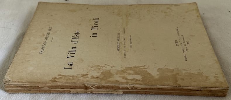 Edizione del 1902 di questa monografia sulla Villa d'Este in Tivoli scritto da Francesco Saverio Seni. Memorie storiche tratte da documenti inediti. All'interno sono presenti due tavole coperte da velina e alla fine del volume una tavola ripiegata: "Pianta del Palazzo e Villa d'Este in Tivoli" In mediocri condizioni. Copertina assente. Legatura quasi assente. Pagine in buone condizioni generali con fioriture. In 8. Dim. 22x15 cm. Pp. 268+(3)Edition of 1902 of this monography about Villa d'Este in Tivoli written by Francesco Saverio Seni. Hystorical memories from inedit documents. Inside there are two plates covered by tissue paper and at the end of the volume a folded plate: "Pianta del Palazzo e Villa d'Este in Tivoli". In poor conditions. Cover lacks. Binding almost lacks. Pages in good conditions with foxing. In 8. Dim. 22x15 cm. Pp. 268+(3).