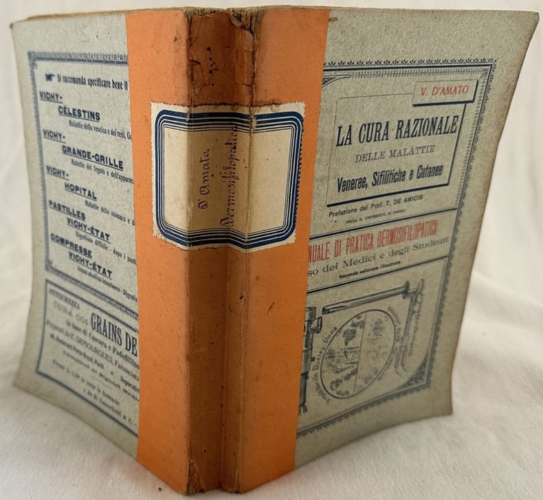Edizione del 1904 di questo manuale sulla cura delle malattie veneree sifilitiche e cutanee scritto da V. D'Amato. Manuale di pratica dermosifilopatica ad uso dei medici e degli studenti. Prefazione del Prof. T. De Amicis. Alcune illustrazioni nel testo. Numerose ricette per gli unguenti e pomate. In buone condizioni. Copertina editoriale con dorso coperto da carta e titolo manoscritto in buone condizioni con lievi usure marginali. Legatura in buone condizioni. Pagine in buone condizioni. In 8. cm. 21x14,5. Pp. (8)+466. Edition of 1904 of this manual about the treatment of venereal deseases and of skin written by V. D'Amato. Manual for the usage of students and physicians. Prefation by Prof. T. De Amicis. Some illustrations in the text. Different recipes for treatments. In good conditions. Editorial cover with spine covered by paper and handwritten title in good conditions lightly worn in the extremities. Binding in good conditions. Pages in good conditions.In 8. cm. 21x14,5. Pp. (8)+466.