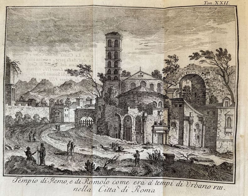 Veduta animata del Tempio di Romolo e Remo come si presentano ai tempi di Urbano VIII. Atlante: Lo stato presente di tutti i popoli del mondo 1738-66 Autore: Thomas Salmon (1679-1767) Data: 1759 Tecnica: incisione su rame Dimensione del foglio: 245x184 mm Dimensione incisione: 200x152 cm Condizioni: Buone. Rare fioriture. PiegatureAn animated view of Terme Novaziane of Rome or of Novato. Atlas: Lo stato presente di tutti i popoli del mondo 1738-66 Autore: Thomas Salmon (1679-1767) Date: 1759 Technique: Copper etching Leaf Dimension:245x184 mm Engraving Dimension:200x152 cm Conditions: Good conditions. Occasional foxing. Foldings<BR><BR> <BR>