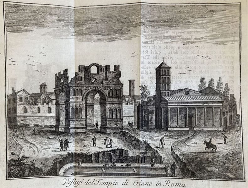 Veduta animata del Tempio di Giano a Roma. Atlante: Lo stato presente di tutti i popoli del mondo 1738-66 Autore: Thomas Salmon (1679-1767) Data: 1759 Tecnica: incisione su rame Dimensione del foglio: 235x183 mm Dimensione incisione: 210x155 cm Condizioni: Buone. Rare fioriture. PiegatureAn animated view of Temple of giano near Rome. Atlas: Lo stato presente di tutti i popoli del mondo 1738-66 Autore: Thomas Salmon (1679-1767) Date: 1759 Technique: Copper etching Leaf Dimension:235x183 mm Engraving Dimension:210x155 cm Conditions: Good conditions. Occasional foxing. Foldings