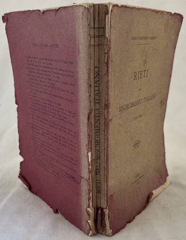 Interessante pubblicazione del 1911, uno studio su Rieti durante il periodo del Risorgimento italiano (1796-1870) scritto da Angelo Sacchetti Sassetti. Insieme al volume un foglio manoscritto con alcuni appunti tratti dal volume "Spoleto nel Risorgimento Nazionale - Tipografia dell'Umbria 1910". Alla fine del volume "Elenco dei volontari reatini". Firma al frontespizio. In buone condizioni. Copertina editoriale in buone condizioni con lievi usure marginali. Legatura in buone condizioni. Pagine in buone condizioni generali con rare fioriture. In 8. Dim. 24,5x16,5 cm. Pp. XIV+(2)+305+(1).Interesting pamphlet of 1911, a study about about Rieti during the period of Risorgimento italiano (1796-1870) written by Angelo Sacchetti Sassetti. Together with the volume an handwritten page with some notes taken from the volume "Spoleto nel Risorgimento Nazionale - Tipografia dell'Umbria 1910". At the end of the volume "Elenco dei volontari reatini". Signature in the title page. In good conditions. Editorial cover in good conditions lightly worn in the extremities. Binding in good general conditions.Inside pages are in good conditions with occasional foxing.In 8. Dim. 24,5x16,5 cm. Pp. XIV+(2)+305+(1).