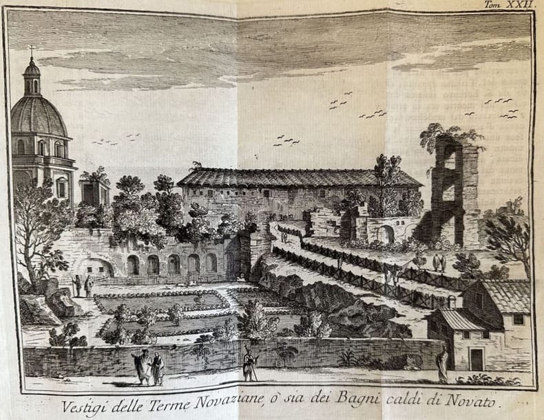 Veduta animata delle Terme Novaziane di Roma o di Novato. Atlante: Lo stato presente di tutti i popoli del mondo 1738-66 Autore: Thomas Salmon (1679-1767) Data: 1759 Tecnica: incisione su rame Dimensione del foglio: 237x184 mm Dimensione incisione: 205x166 cm Condizioni: Buone. Rare fioriture. PiegatureAn animated view of Terme Novaziane of Rome or of Novato. Atlas: Lo stato presente di tutti i popoli del mondo 1738-66 Autore: Thomas Salmon (1679-1767) Date: 1759 Technique: Copper etching Leaf Dimension:237X184 mm Engraving Dimension:205x166 cm Conditions: Good conditions. Occasional foxing. Foldings<BR><BR> <BR>