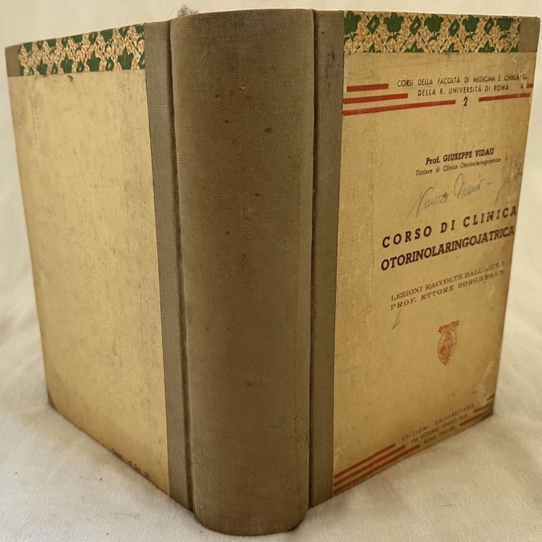 Rara raccolta di appunti delle lezioni di Clinica otorinolaringojatrica dettate nella Regia Università di Roma dal Prof. Giuseppe Vidau . Gli appunti sono stati redatti in copia battuta a macchina da scrivere. Lezioni raccolte dall'aiuto Prof. Ettore Borghesan. Firma in copertina. In ottime condizioni. Copertina cartonata editoriale in ottime condizioni con lievi usure ai margini e dorso. Legatura in buone condizioni. Pagine in ottime condizioni con rare fioriture. In 8. Dim. 24,5x19 mm. Pp. 962. Peso Kg. 1,400.Scarce collection of notes from the lessons of Clinics otorinolaringojatrica told in Regia Unviersity of Rome by Prof. Giuseppe Vidau . The notes have been written a typewritten copy. Lessons collected by the help teacher Prof. Ettore Borghesan. Signature in the cover. In very good conditions. Carton editorial cover in very good conditions lightly worn in the extremities. Binding in good conditions. Pages in very good conditions with occasional fox1ing. Reinforcement in the extremities of pag. 260 and 261 with light loss of text. In 8. Dim. 24,5x19 mm. Pp. 962. Weight Kg. 1,400.