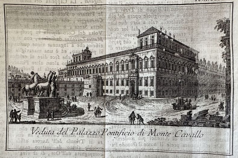 Veduta animata del Quirinale a Roma Atlante: Lo stato presente di tutti i popoli del mondo 1738-66 Autore: Thomas Salmon (1679-1767) Data: 1759 Tecnica: incisione su rame Dimensione del foglio: 245x180 mm Dimensione incisione: 205x155 cm Condizioni: Buone. Rare fioriture. Animated view of Quirinale Palace in Rome Atlas: Lo stato presente di tutti i popoli del mondo 1738-66 Autore: Thomas Salmon (1679-1767) Date: 1759 Technique: Copper etching Leaf Dimension: 245x180 mm Engraving Dimension: 205x155 cm Conditions: Good conditions. Occasional foxing. <BR><BR>