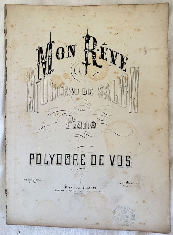 Edizione del 1870 circa di questo spartito per pianoforte della melodia "Mon Reve Morceau de Salon" di Polydore de Vos. In buone condizioni. Copertina assente. Legatura editorialmente assente. Pagine in buone condizioni con fioriture. In folio. cm. 35x26. Pp. 11.Edition of 1870 of this score "Mon Reve Morceau de Salon" by Polydore de Vos In good conditions. Cover lacks. Binding is editoriarly missing. Pages in good conditions with foxing.In folio. cm. 35x26. Pp. 11.