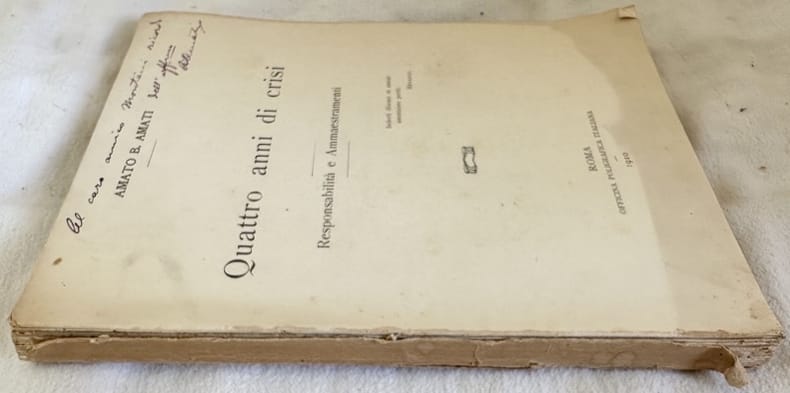 Edizione del 1910 di questo studio sulla crisi del 1907 scritto da Amato B. Amati. Dedica dell'autore al frontespizio. Dall'indice: La crisi mondiale, La crisi in Italia. In discrete condizioni. Copertina editoriale in discrete condizioni con lievi usure marginali. Piatto anteriore assente. Legatura in discrete condizioni con rotture. Pagine in buone condizioni con rare fioriture. In 16. cm. 21x15,5. Pp. 214.Edition of 1910 of this study about the crisis of 1907 written by Amato B. Amati. Dedication of the author in the title page. From the index: crisis in the world and in Italy. In fair conditions. Editorial cover in fair conditions lightly worn in the extremities. Front plate lacks. Binding in fair conditions with cracks. Pages in good conditions with occasional foxing. In 16. cm. 21x15,5. Pp. 214.