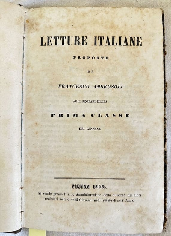 Edizione del 1853 di questa raccolta di letture italiane a cura di Francesco Ambrosoli per la prima classe del ginnasio. All'interno brani di Adriani, Grazzini, Aristotele tradotto da Annibal Caro, Segneri, Parini, Gozzi, Berni, Cassiodoro, Euripide tradotto da F. Bellotti, Giordani, Machiavelli, Tasso, Vasari, Sforza Pallavicino, Annibal Caro, Manzoni, Dante, Pandolfini, Dati, Redi, Ariosto, Sperone Speroni, Dino Campagni, Malispini, Fra Guittone d'Arezzo, Davanzati, Capilupi, Sacchetti, Malispini, Bartoli, Gaspara Stampa, Vittoria Colonna, Cocchi, Giambullari, Boccaccio, Bonfadio, Pindemonte, Leopardi, Giovanni di Catignano, Feo Belcari, Colombo, Fortiguerra, Menzini, Davila, Poliziano, Castiglioni, Chiabrera, Baretti ecc... In buone condizioni. Copertina in mezza tela in ottime condizioni con lievi usure marginali. Legatura in buone condizioni. Pagine in buone condizioni con fioriture. In 8. cm. 21x13,5. Pp. IV+194.Edition of 1853 of this collection of italian readings written by Francesco Ambrosoli for the first class of high school. inside texts of Adriani, Grazzini, Aristotele tradotto da Annibal Caro, Segneri, Parini, Gozzi, Berni, Cassiodoro, Euripide tradotto da F. Bellotti, Giordani, Machiavelli, Tasso, Vasari, Sforza Pallavicino, Annibal Caro, Manzoni, Dante, Pandolfini, Dati, Redi, Ariosto, Sperone Speroni, Dino Campagni, Malispini, Fra Guittone d'Arezzo, Davanzati, Capilupi, Sacchetti, Malispini, Bartoli, Gaspara Stampa, Vittoria Colonna, Cocchi, Giambullari, Boccaccio, Bonfadio, Pindemonte, Leopardi, Giovanni di Catignano, Feo Belcari, Colombo, Fortiguerra, Menzini, Davila, Poliziano, Castiglioni, Chiabrera, Baretti ecc... In good conditions. Half cloth cover in very good conditions lightly worn in the extremities. Binding in good conditions. Pages in good conditions with foxing. In 8. cm. 21x13,5. Pp. IV+194.
