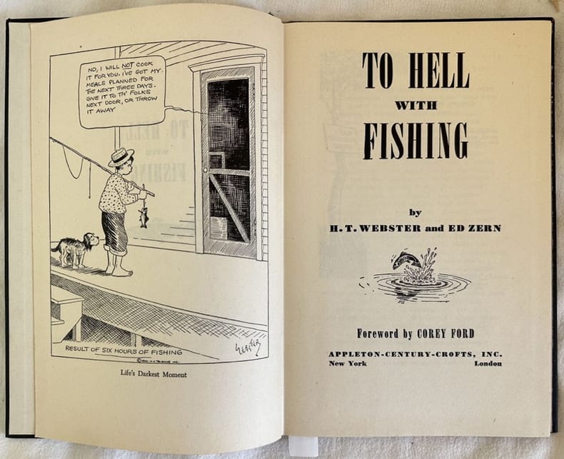Edizione del 1945 di questo manuale di pesca sportiva di H. T. Webster ed Ed Zern. All'interno: come utilizzare i pesci morti, come acchiappare pesci con le mosche, come fare un torrente per le trote, perchè gli stupidi acchiappano più trote delle persone intelligenti, la natura non è naturale, pesca grossa, pesca occidentale, La verità su Izaak Walton ecc... Una vignetta umoristica a fronte di ogni testo. In ottime condizioni. Copertina cartonata editoriale in ottime condizioni con lievi usure marginali. Legatura in buone condizioni. Pagine in ottime condizioni. In 8. cm. 24x16. Pp. 86+(2). Edition of 1945 of this manual of sport fishing by H. T. Webster and Ed Zern. Inside: How to dispose of dead fish, ain's it the truth, How to catch fish with flies, How to wade a trout stream, Why dumb people catch more trout than smart people, How to tell fish from fishermen, Big game fishing, The Low down on Western Fishing, The truth about Izaak Walton ecc... A humour vignette in front of each text. In very good conditions. Carton editorial cover in very good conditions lightly worn in the extremities. Binding in good conditions. Pages in very good conditions.In 8. cm. 24x16. Pp. 86+(2).