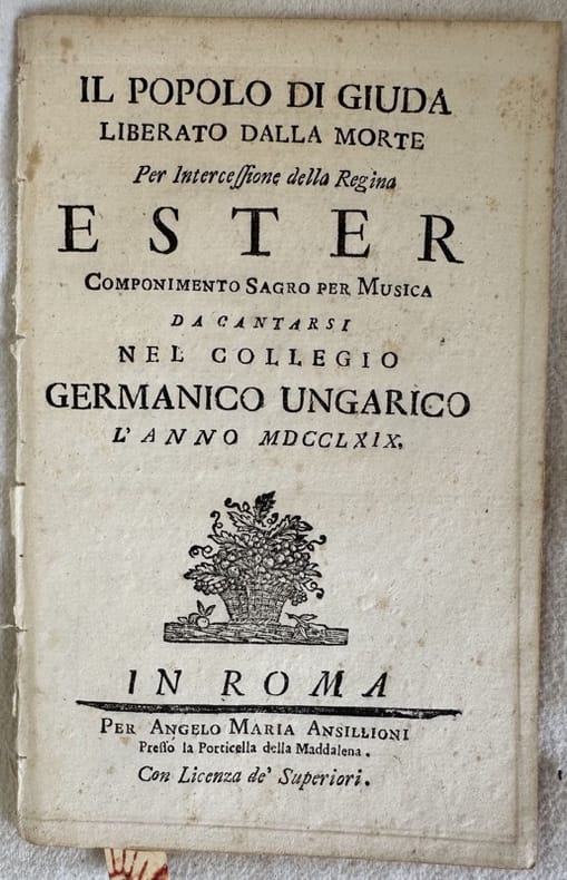 Rarissima prima edizione del libretto "Il popolo di Giuda liberato dalla morte per intercessione della Regina Ester" musicato da Antonio Sacchini (1730-1786) compositore fiorentino.<BR><BR>Allievo di Durante a Napoli fu attivo come compositore di opere, musica sacra e da camera a Napoli, Venezia, Germania e Inghilterra prima di stabilirsi a Parigi nel 1782 (Cfr. Opac SBN)<BR><BR>A p. 8 e 18 cartoncino incollato a sostitutire un'aria di Assuer (Pupille belle) e "Quel caro figlio, oh Dio!".<BR><BR>Indicazione del compositore a pag. 3.<BR><BR>Solo due copie censite.<BR><BR>In buone condizioni e completo. <BR><BR>Copertina assente. Legatura in buone condizioni. All'interno le pagine si presentano in buone condizioni con rare fioriture. In 16. Dim. 17,5x11 cm. Pp. 24. Very scarce first edition of the booklet "Il popolo di Giuda liberato dalla morte per intercessione della Regina Ester" with music by Antonio Sacchini (1730-1786) composer from Florence.<BR><BR> <BR><BR>Student of Durante in NAplees, he was active as a composer of operas, holy and camera music in Naples, Venice, Germany and England before going to Paris in 1782 (Cfr. Opac SBN)<BR><BR> <BR><BR>Little cardboard in p. 8 and 18 applied to substitute text (Pupille belle) e "Quel caro figlio, oh Dio!".<BR><BR> <BR><BR>Indication of composer in pag. 3.<BR><BR> <BR><BR>Only two copies registered.<BR><BR> <BR><BR>In good conditions and complete. <BR><BR> <BR><BR> <BR><BR>Cover lacks. Binding in good conditions. Pages in good conditions with occasional foxing. In 16. Dim. 17,5x11 cm. Pp. 24.
