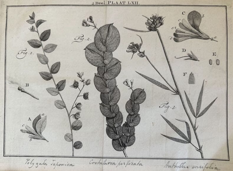 Finissima incisione tratta dalla monumentale opera di botanica "Natuurlyke historie" del naturalista olandese Maarten Houttuyn (1720-1798). Nomi delle specie manoscritti a matita. Atlante: Natuurlyke historie of uitvoerige Beschryvingder Dieren Planten Autore: Maarten Houttuyn (1720-1798) - G. Philipps Data: 1761/1773 Tecnica: Acquaforte Dimensione del foglio: 260x202 mm Dimensione incisione: 240x166 cm Condizioni: Buone. Fioriture.Very fine engraving taken from the monumental work of botany "Natuurlyke historie" by the durch engraver Maarten Houttuyn (1720-1798). Atlas: Natuurlyke historie of uitvoerige Beschryvingder Dieren Planten Author: Maarten Houttuyn (1720-1798) - G. Philipps Date: 1761/1773 Technique: Etching Leaf Dimension:260x202 mm Engraving Dimension:240x166 cm Conditions: Good conditions. Foxing