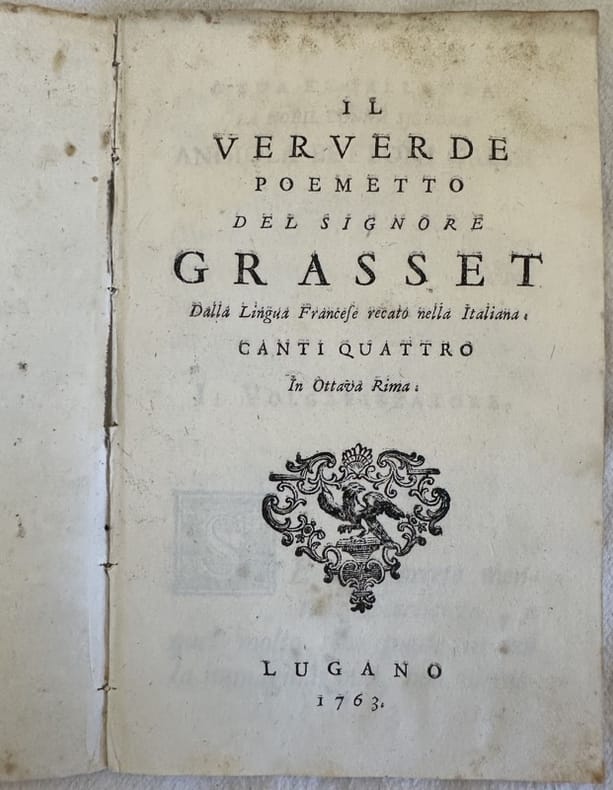 Rarissima prima edizione italiana del 1763 di questo scanzonato poemetto "Vert-vert" scritto da Jean Baptiste Louis Gresset (1709-1777) poeta e drammaturgo francese. Luogo di pubblicazione falso (Lugano invece Venezia); nome dell'editore nella licenza di stampa (Andrea Rapetti). L'opera di chiaro stampo anticlericale narra la divertente storia di un pappagallo conteso dalle suore di due conventi. Il malcontento dell'Ordine dei Gesuitì finì per porre finire al suo periodo di noviziato ma gli valse la celebrità. Tagli marmorizzati. In buone condizioni e completo. Copertina assente. Legatura in buone condizioni. All'interno le pagine si presentano in buone condizioni con rare fioriture. In 16. Dim. 17,5x11,5 cm. Pp. (8)+22+(1). Very scarce first italian edition of 1763 of the "Vert-vert" by the french poet and drama writer Jean Baptiste Louis Gresset (1709-1777). False place of publishing (Lugano instead of Venezia); name of the editor in the publishing license (Andrea Rapetti). The work os clear antic lergy mark talks about the funny story of a parrott who lived in a convent of Nevers. The order of Jesuits were not happy of the pome and Gresset was forced to leave the Order of Jesuits but became famous. Marbled external edges of pages In good conditions and complete. Cover lacks. Binding in good conditions. Pages in good conditions with occasional foxing. In 16. Dim. 17,5x11,5 cm. Pp. (8)+22+(1).