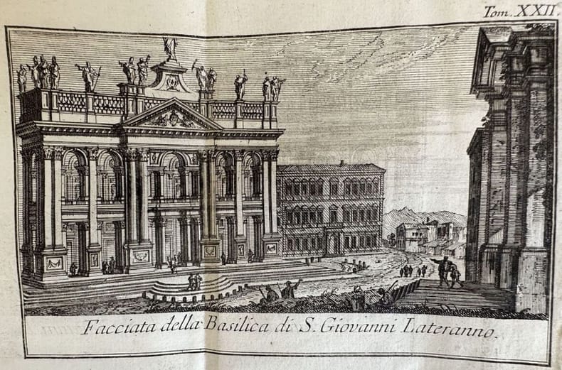 Veduta animata di San Giovanni Laterano a Roma. Atlante: Lo stato presente di tutti i popoli del mondo 1738-66 Autore: Thomas Salmon (1679-1767) Data: 1759 Tecnica: incisione su rame Dimensione del foglio: 172x137 mm Dimensione incisione: 154x97 cm Condizioni: Buone. Rare fioriture. Piccolo strappo marginale.An animated view of San Giovanni Laterano in Rome. Atlas: Lo stato presente di tutti i popoli del mondo 1738-66 Autore: Thomas Salmon (1679-1767) Date: 1759 Technique: Copper etching Leaf Dimension: 172x137 mm Engraving Dimension:154x97 cm Conditions: Good conditions. Occasional foxing.