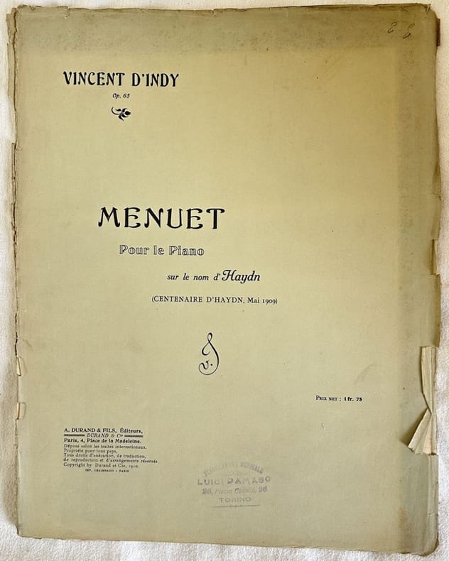 Edizione del 1916 di questo spartito per pianoforte della melodia "Menuet sur le nom d'Haydn (Centenaire d'Haydn Mai 1909)" del compositore francese Vincent D'Indy (1851-1931). In buone condizioni. Copertina editoriale in discrete condizioni con lievi usure marginali. Piatti staccati. Legatura editorialmente assente. Pagine in buone condizioni con rare fioriture. In folio. cm. 35,5x27,5. Pp. 5Edition of 1916 of this melody for piano "Menuet sur le nom d'Haydn (Centenaire d'Haydn Mai 1909)" by the french composer Vincent D'Indy (1851-1931). In good conditions. Editorial cover in good conditions lightly worn in the extremities. Plates are detached. Binding editoriarly missing. Pages in good conditions with occasional foxing. In folio. cm. 35,5x27,5. Pp. 5