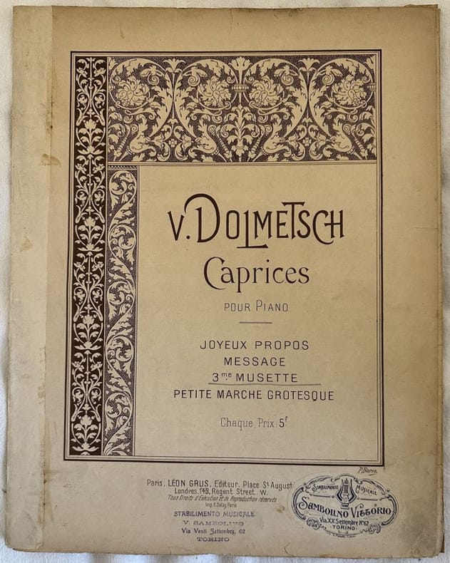 Edizione dei primi del novecento di questo spartito per pianoforte della melodia "3me Musette (en re majeur)" dall'opera 119 di V. Dolmetsch. In discrete condizioni. Copertina editoriale in discrete condizioni con lievi usure marginali. Legatura in buone condizioni. Pagine in discrete condizioni con rare fioriture e rinforzi marginali. In folio. cm. 35x27. Pp. 7.Edition of early 20th century of this score "3me Musette (en re majeur)" from the opera 119 by V. Dolmetsch. In fair conditions. Editorial cover in fair conditions lightly worn in the extremities. Binding in good conditions. Pages in fair conditions with occasional foxing and reinforcement in the edges.In folio. cm. 35x27. Pp. 7.
