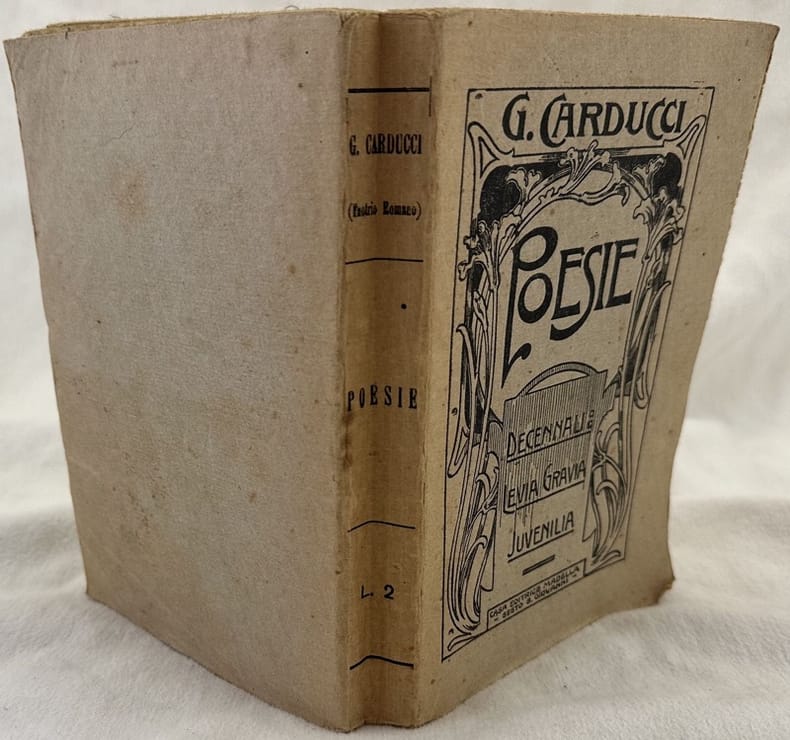 Edizione del 1912 di questa raccolta di poesie del poeta e scrittore Giosuè Carducci (1835-1907). All'interno: Decennali, Levia Gravia, Juvenilia.<BR>Copertina editoriale originale. In buone condizioni. Copertina editoriale in buone condizioni generali con lievi usure marginali. Legatura in discrete condizioni con qualche pagina allentata. Pagine in buone condizioni con fioriture. In 8. cm 19,5x13. Pp. XVI+336.Edition of 1912 of this colleciton of poems by the poet and humanist Giosuè Carducci (1835-1907). Editorial cover. In good conditions. Editorial cover in good conditions lightly worn in the extremities. Binding in fair conditions with some loose pages. Pages in good conditions with foxing. In 8. cm 19,5x13. Pp. XVI+336.