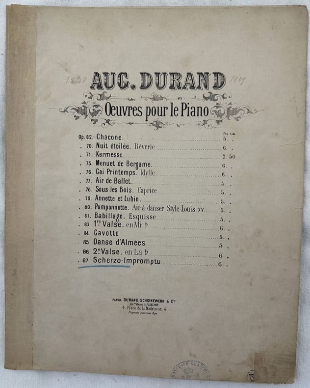 Edizione del 1880 circa della melodia per pianoforte "Scherzo-improptu" dall'opera 62 del compositore francese Auguste Durand (1830-1909). Nota manoscritta al piatto posteriore con una serie di nomi datata 11 marzo 1887 In buone condizioni. Copertina editoriale in discrete condizioni con lievi usure marginali. Dorso rinforzato con carta. Legatura in buone condizioni. Pagine in buone condizioni con rare fioriture. Usure marginali. In folio. cm. 35x27. Pp. 9. Edition of 1880 circa of the melody for piano "Scherzo-improptu" from the work 62 by the french composer Auguste Durand (1830-1909). Handwritten note in the back plate with a series of names dated 11st of march 1887. In good conditions. Editorial cover in fair conditions lightly worn in the extremities. Spine reinforced with paper. Binding in good conditions. Pages in good conditions with occasional foxing. Worn edges. In folio. cm. 35x27. Pp. 9.