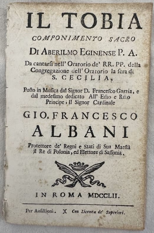 Raro libretto della prima rappresentazione del componimento "Il Tobia" di Aberilmo Eginense pseudonimo di Giovanni Antonio Battista Visconti (Vernazza 1722-1784) membro delle Accademie degli Aborigeni, Infecondi, Forti, Umbri di Foligno. Musica di Francisco Javier Garcia Fajer (1731-1809). In buone condizioni. Copertina assente. Legatura in buone condizioni. Pagine in buone condizioni con fioriture. In 16. 17,5x11,5 cm. Pp. 24.Scarce booklet of the first representeation of the component "Il Tobia" by Aberilmo Eginense pseudonymous of Giovanni Antonio Battista Visconti (Vernazza 1722-1784) member of Accademie degli Aborigeni, Infecondi, Forti, Umbri di Foligno. Music by Francisco Javier Garcia Fajer (1731-1809). In good conditions. Cover lacks. Binding in good conditions. Inside pages are in good conditions with foxing. In 16. 17,5x11,5 cm. Pp. 24.