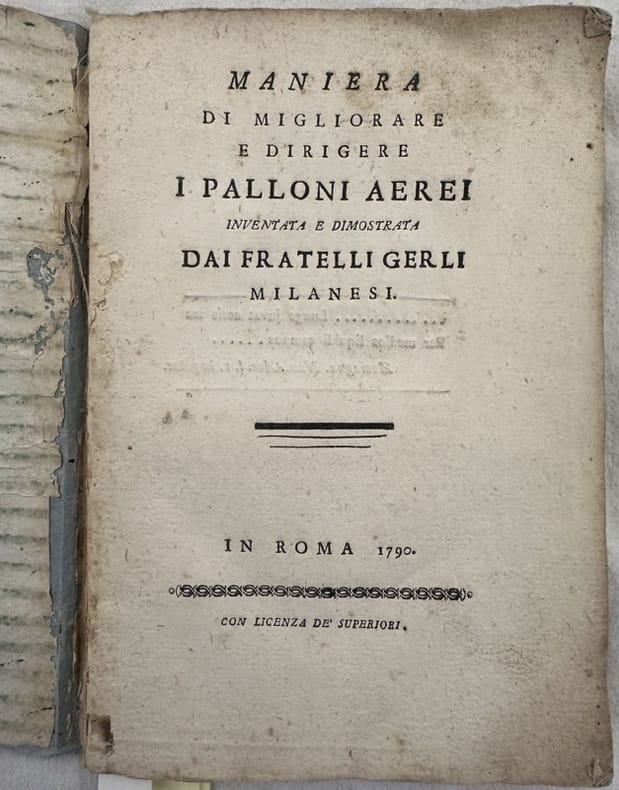 Rarissimo trattatto del 1790 sulla progettazione e miglioramento delle mongolfiere scritto dai fratelli Gerli. Nel 1784 i milanesi Carlo Giuseppe e Agostino Gerli su commissione del Conte Carlo Andreani costruirono la prima macchina aerostatica italiana sulla base di quella creata nel 1783 in Francia dai fratelli Montgolfier ma migliorandola notevolmente, tanto da renderla più simile alle moderne mongolfiere. "Il 19 genn. 1784, a Milano, alla presenza del ministro plenipotenziario conte J.J. von Wilczeck, i Gerli fecero innalzare un prototipo di palloncino che si elevò circa a un'altezza doppia della maggiore guglia del duomo. In seguito ai buoni risultati conseguiti venne intrapresa la costruzione dell'aerostato che avrebbe compiuto l'ascensione con uomini a bordo. Dopo 24 giorni di intenso lavoro, i tre fratelli realizzarono una mongolfiera costituita da un pallone del diametro di circa 21 m, costruito in tela internamente foderata di carta, con l'alloggio dell'equipaggio consistente in una grande cesta di vimini unita al pallone da un insieme di corde. Sotto la bocca del globo vi era un braciere, alimentato a legna imbevuta di un particolare bitume liquido, realizzato da Giuseppe. Dopo due infruttuosi tentativi, a mezzogiorno del 25 febbr. 1784, alla presenza di più di 2000 spettatori, la macchina aerostatica si innalzò presso la villa Andreani di Moncucco, nei dintorni di Brugherio, con a bordo il committente conte Paolo Andreani e i fratelli Gerli. Il pallone, dopo aver raggiunto l'altezza di circa 350 m, scese a un quarto di miglio dalla villa, in direzione di Monza. Dopo alcune modifiche all'apparecchiatura, fu tentato un secondo volo il 13 marzo dello stesso anno, con a bordo Andreani e due suoi dipendenti; il pallone, dopo un volo di 24 minuti, atterrò nelle vicinanze di Caponago (Opuscoli, pp. 1-17)." Nell'opera gli autori rendono noti i risultati dei loro studi di progettazione. Alla fine del volume due tavole ripiegate. In discrete condizioni e completo Copertina morbida decorata con rinforzo cartaceo al dorso in buone condizioni con lievi usure ai margini e dorso. Legatura in discrete condizioni con lievi rotture. Corpo del libro in parte staccato. Pagine in buone condizioni con fioriture. Piccolo strappo all'ultima carta che non lede il testo. In 8. 21x15 cm. Pp. 51+2 tav.. Very scarce treaty of 1790 about construction and improving of hot air balloon written by brother Gerli. In 1784 Carlo Giuseppe e Agostino Gerli from Milan on behalf of Conte Carlo Andreani build the first italian aerostatic balloon based on that created in 1783 in France by the brothers Montgolfier but much improved, so much that it was similar to other hot air balloons. In the work they describes their work showing the results of their project. "Il 19 genn. 1784, a Milano, alla presenza del ministro plenipotenziario conte J.J. von Wilczeck, i Gerli fecero innalzare un prototipo di palloncino che si elevò circa a un'altezza doppia della maggiore guglia del duomo. In seguito ai buoni risultati conseguiti venne intrapresa la costruzione dell'aerostato che avrebbe compiuto l'ascensione con uomini a bordo. Dopo 24 giorni di intenso lavoro, i tre fratelli realizzarono una mongolfiera costituita da un pallone del diametro di circa 21 m, costruito in tela internamente foderata di carta, con l'alloggio dell'equipaggio consistente in una grande cesta di vimini unita al pallone da un insieme di corde. Sotto la bocca del globo vi era un braciere, alimentato a legna imbevuta di un particolare bitume liquido, realizzato da Giuseppe. Dopo due infruttuosi tentativi, a mezzogiorno del 25 febbr. 1784, alla presenza di più di 2000 spettatori, la macchina aerostatica si innalzò presso la villa Andreani di Moncucco, nei dintorni di Brugherio, con a bordo il committente conte Paolo Andreani e i fratelli Gerli. Il pallone, dopo aver raggiunto l'altezza di circa 350 m, scese a un quarto di miglio dalla villa, in direzione di Monza. Dopo alcune modifiche all'apparecchiatura, fu tentato un secondo volo il 13 marzo dello stesso anno, con a bordo Andreani e due suoi dipendenti; il pallone, dopo un volo di 24 minuti, atterrò nelle vicinanze di Caponago (Opuscoli, pp. 1-17)." At the end of the volume there are two foldd plates. In fair conditions and complete Soft decorated cover with paper reinforcement in the spine in good conditions lightly worn in the extremities. Binding in fair conditions with light cracks. The body of the book partially detached. Inside pages are in good conditions with foxing. Little tear in the last page not ruining the text. In 8. 21x15 cm. Pp. 51+2 tav..