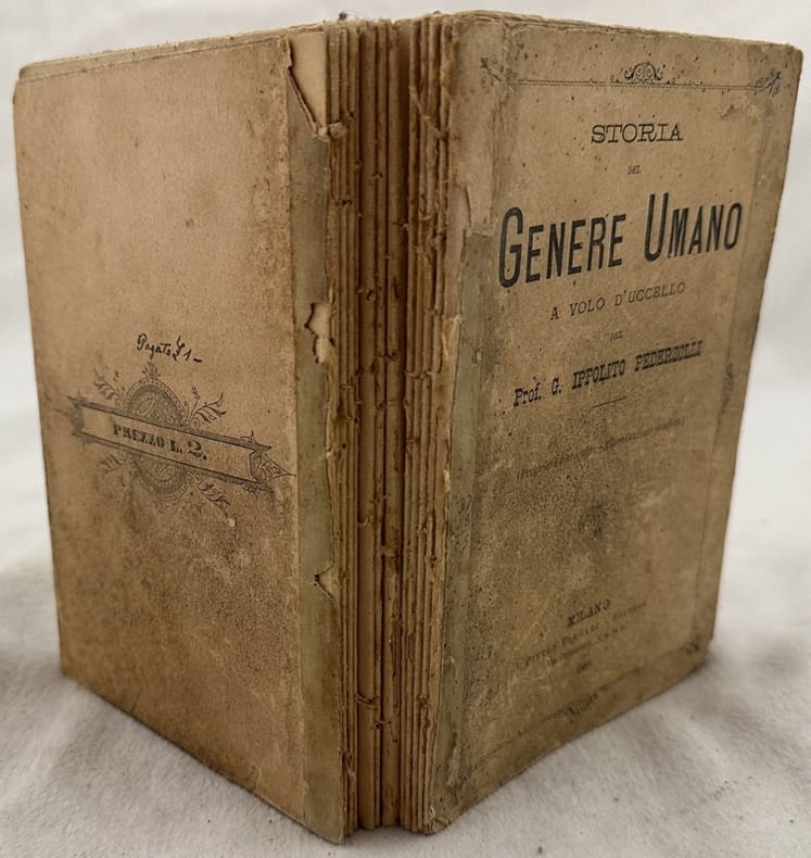 Prima edizione del 1889 di questo manuale di storia scritto dal trentino Ippolito Pederzolli (Riva del Garda 1839-Milano 1902). Pederzolli lasciò il Trentino perchè totalmente contrario alla dominazione austriaca. Restò in contatto con altri "grandi" del Risorgimento italiano come Giuseppe Garibaldi, Giuseppe Mazzini e Carlo Cattaneo. In discrete condizioni. Copertina editoriale cartonata in discrete condizioni generali con usure ai margini e dorso. Mancanze al dorso. Legatura in discrete condizioni con rotture. All'interno le pagine si presentano in buone condizioni con fioriture. In 16. cm 17,5x12. Pp. 197+(1). First edition of 1889 of this manual of history by the writer from Trentino Ippolito Pederzolli (Riva del Garda 1839-Milano 1902). Pederzolli leaved Trentino because totally contrary to austrian domination. He was in contact with other "bigs" of italian Risorgimento as Giuseppe Garibaldi, Giuseppe Mazzini and Carlo Cattaneo. In fair conditions. Editorial cover in fair conditions with wearings in the extremities and spine. Binding in poor conditions with cracks. Inside pages are in good conditions with foxing.In 16. cm 17,5x12. Pp. 197+(1).