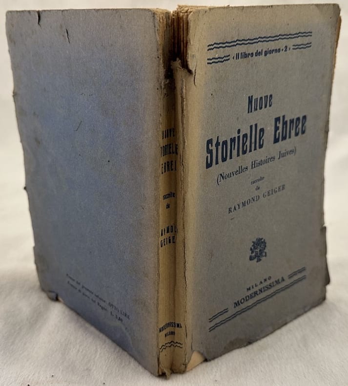 Edizione del 1920 circa di questa raccolta di storielle ebree raccolte da Raymond Geiger. In discrete condizioni. Copertina editoriale in discrete condizioni generali con usure ai margini e dorso. Legatura quasi assente. All'interno le pagine si presentano in buone condizioni con fioriture. In 8. Dim. 19,5x13 cm. Pp. 212. Edition of early 20th century of this collection of jewish short novels collected by Raymond Geiger. In fair conditions. Editorial cover in fair general conditions lightly worn in the extremities. Binding almost lacks. Inside pages are in good conditions with foxing. In 8. Dim. 19,5x13 cm. Pp. 212.