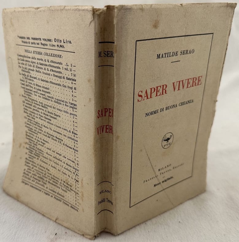 Edizione Treves del 1924, nono migliaio, di questo manuale del Galateo della scrittrice e giornalista Matilde Serao (1856-1927). Serao è stata la prima donna ad aver fondato e diretto un quotidiano. All'interno: Fidanzamento, richiesta di nozze, corredo, padrino di matrimonio, nozze civili, nozze religiose, nozze religiose, luncheon, viaggio di nozze, Partecipazioni, visite di nozze, L'unione mondana Lista mensa (invito a pranzo, grandi pranzi, Pranzo di mezza cerimonia), Festa da ballo, Piccolo intermezzo , I legami dello spirito i Sacramenti, Avvertenza (villeggiatura) Natale e Capo d'anno, L'educazione in Chiesa, La nota dolente (il lutto, come bisogna vestirsi, condoglianze visite, il lutto: uomini bimbipersone famigliari ec.. In buone condizioni. Copertina editoriale in buone condizioni generali con lievi usure ai margini e dorso. Legatura in buone condizioni. All'interno le pagine si presentano in buone condizioni con rare fioriture. In 16. Dim. 17x11,5 cm. Pp. (8)+240+(6). Treves edition of 1924, 9th thousand of this manual of Good Manners by the writer and journalist Matilde Serao (1856-1927).<BR>Serao has been the first woman to establish a newspaper.<BR>Editorial original cover. In good conditions. Editorial cover in good general conditions lightly worn in the extremities. Binding in good conditions. Inside pages are in good conditions with occasional foxing. In 16. Dim. 17x11,5 cm. Pp. (8)+240+(6).