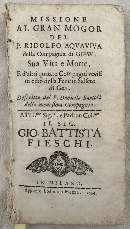 Edizione del 1664 di questo resoconto della vita e missione alla Corte del Gran Mogol del Padre Rodolfo Acquaviva scritto da Daniello Bartoli. Padre Ridolfo Acquaviva fu ordinato nel 1578 a Lisbona, partendo il 24 marzo 1578 per Goa dove insegnò filosofia. Tra il 1580 e il 1583 a capo d'una missione, per la grande stima e fiducia dei suoi superiori venne mandato alla corte del Gran Mogol, Akbar a Fatehpur Sikri. Di ritorno a Goa, nel 1583, prese la direzione della missione in Salcete ma fu nello stesso anno uccisio nel villaggio di Concolim con altri confratelli (Courtesy Wikipedia). Al verso dell'ultima carta xilografia con simbolo della Compagnia di Gesu. In buone condizioni. Copertina assente. Legatura in discrete condizioni con lievi rotture e ultime due carte quasi staccate. Pagine in buone condizioni con fioriture. Piccola piegatura all'angolo inferiore destro delle prime 32 pagine. In 16. 15x8 cm. Pp. (6)+193+(3). Edition of 1664 of this resuming of life and mission in the Court of Gran Mogol by the Father Rodolfo Acquaviva written by Daniello Bartoli. Father Ridolfo Acquaviva was ordered priest in 1578 in Lisbona, leaving the 24th of march 1578 to Goa where he teached phylosophy. Between 1580 and 1583 he was chief of a mission, and was sent in Gran Mogol Court, Akbar in Fatehpur Sikri. He came back in Goa, in 1583, went in the mission of Salcete but in the same year was killed in the village of Concolim with other brothers (Courtesy Wikipedia). In the verso of the last page woodcut with symbol of Company of Jesus. In good conditions. Cover lacks. Binding in fair conditions with light cracks and the last two pages almost detached. Inside pages are in good conditions with foxing. Little folding in the lower right corner of the first 32 pages all'angolo inferiore destro delle prime 32 pagine. In 16. 15x8 cm. Pp. (6)+193+(3).