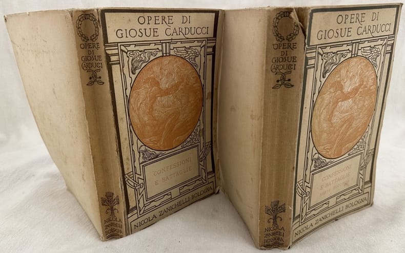 Edizione del 1885 dell'opera "Confessioni e battaglie" del poeta e scrittore Giosuè Carducci (1835-1907). Copertina editoriale originale.<BR>In buone condizioni. Copertina editoriale in buone condizioni generali con lievi usure marginali. Legatura in discrete condizioni con lievi rotture. Pagine in buone condizioni con rare fioriture. In 8. cm 20x12,5. Pp. 484+488. Edition of 1885 of the work "Confessioni e battaglie" byt he writer and poet Giosuè Carducci (1835-1907). Editorial cover. In good conditions. Editorial cover in good conditions lightly worn in the extremities. Binding in fair conditions with light cracks. Pages in good conditions with occasional foxing. In 8. cm 20x12,5. Pp. 484+488.