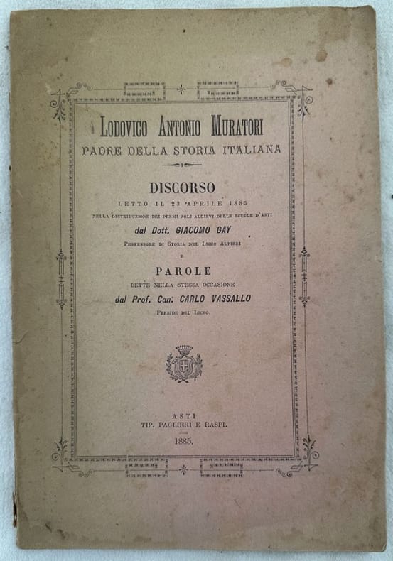 Interessante pubblicazione del 1885 dello storico e scrittore Ludovico Antonio Muratori (1672-1750).<BR><BR>Discorso letto il 23 aprile 1885 nella distribuzione dei premi agli allievi delle scuole d'Asti dal Dott. Giacomo Gay e dal Prof. Carlo Vassallo.<BR><BR>In buone condizioni.<BR><BR>Copertina editoriale in buone condizioni generali con lievi usure ai margini e dorso. Legatura in discrete condizioni con lievi rotture. All'interno le pagine si presentano in buone condizioni con fioriture. In 8. Dim. 23,5x15,5 cm. Pp. 51+(1).Interesting pamphlet of 1885 by the historian and writer Ludovico Antonio Muratori (1672-1750).<BR><BR>Speech read the 23rd of april 1885 in the distribution of prizes to the students of Asti by Dott. Giacomo Gay and Prof. Carlo Vassallo.<BR><BR>In good conditions.<BR><BR>Editorial cover in good general conditions lightly worn in the extremities. Binding in fair conditions with light cracks. Inside pages are in good conditions with foxing. In 8. Dim. 23,5x15,5 cm. Pp. 51+(1).