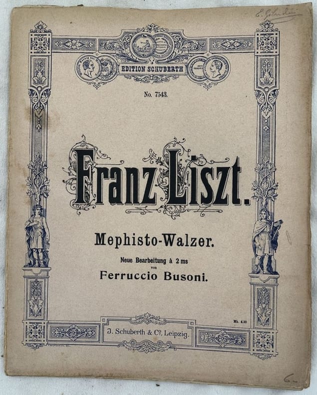 Edizione del 1904 della melodia "Mephisto Walzer" di Franz Liszt (1811-1886) ridotto a due mani da Ferruccio Busoni. Illustrazione in copertina e al frontespizio. In buone condizioni. Copertina editoriale in buone condizioni con lievi usure marginali. Legatura in buone condizioni. Pagine in buone condizioni con rare fioriture. In Folio. cm. 34,5x27,5. Pp. 33.Edition of 1904 of the melody "Mephisto Walzer" by Franz Liszt (1811-1886) reduced in two hands by Ferruccio Busoni. illustration in the cover and title page. In good conditions. Editorial cover in good conditions lightly worn in the extremities. Binding in good conditions. Pages in good conditions with occasional foxing. In Folio. cm. 34,5x27,5. Pp. 33.