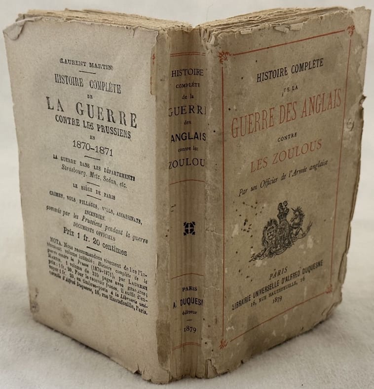 Rarissima opera del 1879, un resoconto completo della guerra Anglo-Zulu (11/1/1879-4/7/1879). Autore anonimo ma, come indicato al frontespizio l'autore è un ufficiale dell'Armata dell'Impero Inglese (sebbene il libro sia in lingua francese). Il libro è stato pubblicato nel 1879, quindi contemporaneo agli avvenimenti. La prima parte è dedicato alla storia e descrizione dell'Africa Meridionale con partioclare riferimento ai governi di Cape, Transvaal, Boers, Nademaal, lavoro nelle miniere. Intonso. In buone condizioni. Copertina editoriale in discrete condizioni generali con usure e strappi ai margini e dorso. Legatura in buone condizioni. Pagine in buone condizioni con rare fioriture. In 24. cm 14x9,5. Pp. 318 Rarissima opera del 1879, un resoconto completo della guerra Anglo-Zulu (11/1/1879-4/7/1879). Autore anonimo ma, come indicato al frontespizio l'autore è un ufficiale dell'Armata dell'Impero Inglese (sebbene il libro sia in lingua francese). Il libro è stato pubblicato nel 1879, quindi contemporaneo agli avvenimenti. La prima parte è dedicato alla storia e descrizione dell'Africa Meridionale con partioclare riferimento ai governi di Cape, Transvaal, Boers, Nademaal, lavoro nelle miniere. Intonso. In buone condizioni. Copertina editoriale in discrete condizioni generali con usure e strappi ai margini e dorso. Legatura in buone condizioni. Pagine in buone condizioni con rare fioriture. In 24. cm 14x9,5. Pp. 318