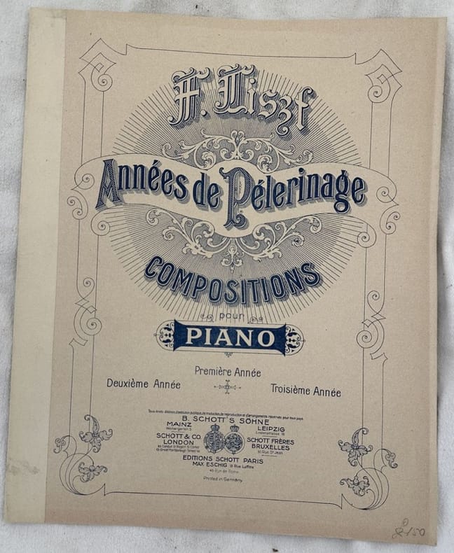 Edizione del 1880 circa della melodia "5 Sunt lacrymae verum en mode hongrois" di Franz Liszt (1811-1886) numero 5 dall'opera "Annees de pelerinage". Copertina illustrata. In buone condizioni. Copertina editoriale in buone condizioni con lievi usure marginali. Dorso ricoperto da carta. Legatura in buone condizioni. Pagine in buone condizioni con rare fioriture. In Folio. cm. 31,5x25,5. Pp. 7.Edition of 1880 circa of the melody "5 Sunt lacrymae verum en mode hongrois" by Franz Liszt (1811-1886) from the opera "Annees de pelerinage". Illustrated cover. In good conditions Editorial cover in good conditions lightly worn in the extremities. Spine covered by paper. Binding in good conditions. Pages in good conditions with occasional foxing. In Folio. cm. 31,5x25,5. Pp. 7.<BR><BR><BR>