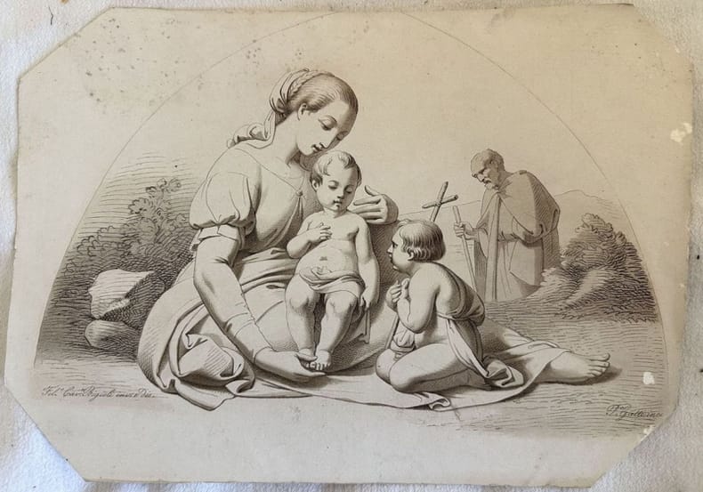 Bella incisione all'acquatinta che rappresenta la Madonna con il bambino, San Giuseppe e San Giovannino in scena campestre. Angoli rifilati. Autore: Pietro Gatti (1832-1851) su disegno di Filippo Bigioli (1798-1854) Data: 1840 circa Tecnica: acquatinta Dimensione del foglio: 29x20,5 cm Dimensione incisione: 27,5x18 cm Condizioni: Buone. Alcune fioriture. Beautiful aquatinct engraving representing Madonna with child, San Giuseppe and San Giovannino in countryard. Cutted corners. Author: Pietro Gatti (1832-1851) after Filippo Bigioli (1798-1854) Date: 1840 circa Technique: aquatinct engraving Page size: 29x20,5 cm Engraving size: 27,5x18 cm Conditions: Good conditions. Some foxing.