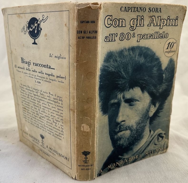 Prima edizione del 1929 di questo resoconto di salvataggio del capitano degli alpini Gennaro Sora. Sora partì in spedizione per portare soccorso a Umberto Nobile precipitato sulla banchisa dell'Artide nel 1928. La spedizione fallì e l'alpino si trasformò da soccorritore in naufrago venendo a sua volta salvato dagli idrovolanti svedesi. All'interno sono presenti 57 planches fotografiche che mostrano vari momenti della spedizione.Due mappe finali ripiegate. Insieme al volume la scheda bibliografica originale Mondadori. In buone condizioni. Copertina editoriale con sovraccoperta in buone condizioni generali con lievi usure ai margini e dorso. Legatura in buone condizioni. All'interno le pagine si presentano in buone condizioni con fioriture. in 8. cm. 23x14,5. Pp. 238+(2)First edition of 1929 of this resuming of first aid written by captaine of Alpini Gennaro Sora. Sora went to give aid to Umberto Nobile fallen in Artide in1928. The expedition failed and the alpine was saved by swedish boats. Inside there are 57 photographic plates showing moments of expedition. Two final folded maps. In good conditions Editorial cover with dustjacket in good general conditions lightly worn in the extremities. Binding in good conditions. Inside pages are in good conditions with foxing. in 8. cm. 23x14,5. Pp. 238+(2)<BR><BR>