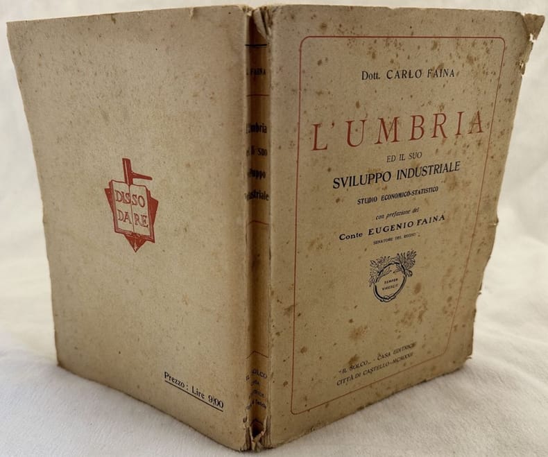 Interessante studio economico statistico del 1922 sull'Umbria e il suo sviluppo industriale scritto dal Dott. Carlo Faina. Prefazione del Conte Eugenio Faina. All'interno:L'Umbria nei suoi aspetti generali (superficie,popolazione,emigrazione,istruzione), L'Umbria agricola ed il suo avvenire (culture principali e loro distribuzione,produzione cereali prati,produzione olio e industria olearia,Vino ed industria enologica,gelso,piante da frutta,boschi,allevamento dei suini), Industrializzazione dell'Umbria (Industria e agricoltura, moviemnto demografico,dei capitali,urbanesimo, organizzazione operaie, disoccupazione operaia). In buone condizioni. Copertina editoriale in buone condizioni generali con lievi usure ai margini e dorso. Legatura in buone condizioni. All'interno le pagine si presentano in buone condizioni con fioriture. In 8. cm. 20x14. Pp. XII+214.Interesting statistic economicalstudy of 1922 about Umbria and his industrial development written by Dott. Carlo Faina. Prefation by Conte Eugenio Faina. In good conditions. Editorial cover in good general conditions lightly worn in the extremities. Binding in good conditions. Inside pages are in good conditions with foxing. In 8. cm. 20x14. Pp. XII+214.